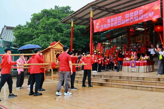 聖山寺金佛殿外高掛「宗教和諧 慈悲同行」大紅布條,敬備香案迎接媽祖鑾轎,在眾人簇擁下,法鼓輕鳴,鑾轎徐行;彰化「銀樓媽祖同樂會」社長陳立偉帶領鑾轎和法語繡旗、神尪進入金佛殿,媽祖安座在三尊金佛雲台上。隨後,善眾移步至福城參觀,感受生命教育與生態永續的美好。