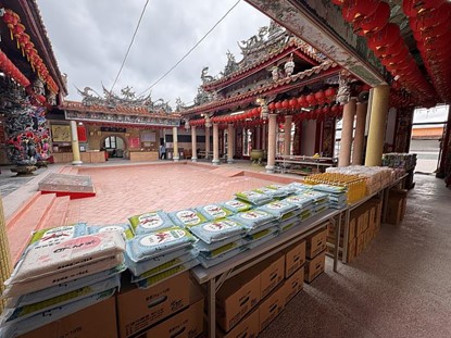 法會現場另一側,充滿感恩與喜悅的氣息。靈鷲山秉持「安土地龍神」的精神,將修法所募得的善款全數轉化為400份公益物資,發放給光復鄉民眾,雖然是油、米、麵等生活必需品,卻也在寒冬中為光復鄉民增添安心的力量。