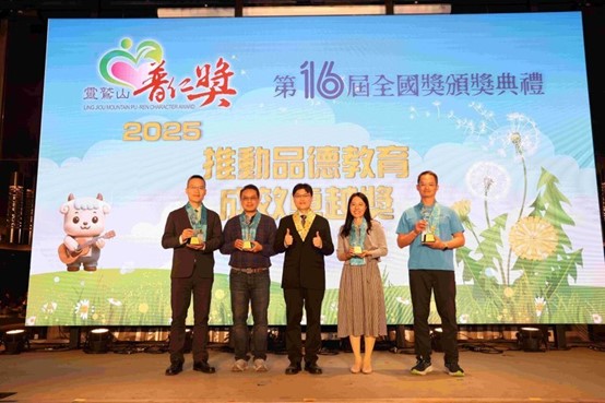 靈鷲山今天也頒發推動品德教育成效卓越獎座,向推動品德教育的學校致敬,得獎名單為新北市清水高中國中部、高雄市桃源國中及宜蘭縣南安國中,並表揚陳坤龍、蕭愛芬等63名資深志工。